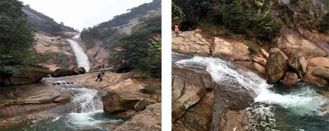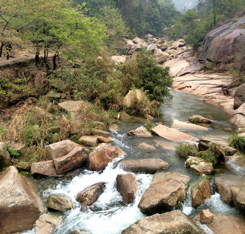 尔后,我们开始攀登旁边的小山,攀爬了十几分钟左右,忽然视野开阔,只见前面小溪水石相间,各处岩石尽展美妙身姿,泉水将溪边的石坡锉圆、擦亮,溪水清可见底,若不是天气微凉,真想光了脚丫子进去凉爽一番。