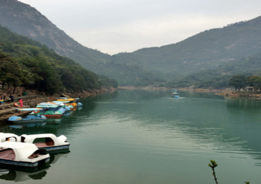 稍作歇息后,我们又开始去感受瑶溪另一个必玩项目,就是划船。来到坐船口,只见一排游船井然有序的系在岸边,仿佛已悉心等待我们许久。湖水清蓝,倒映着两旁山水,如身临画中。安排好人员分配后,我们携各自的小伙伴们上船了。