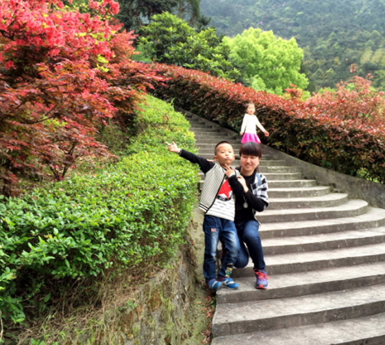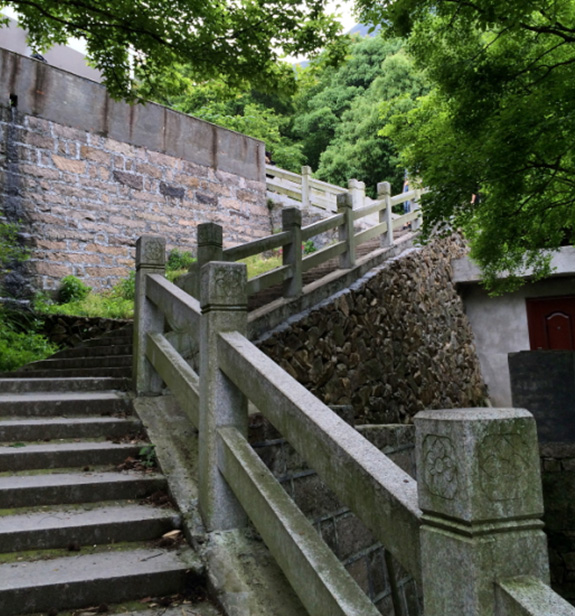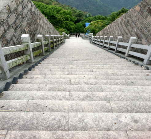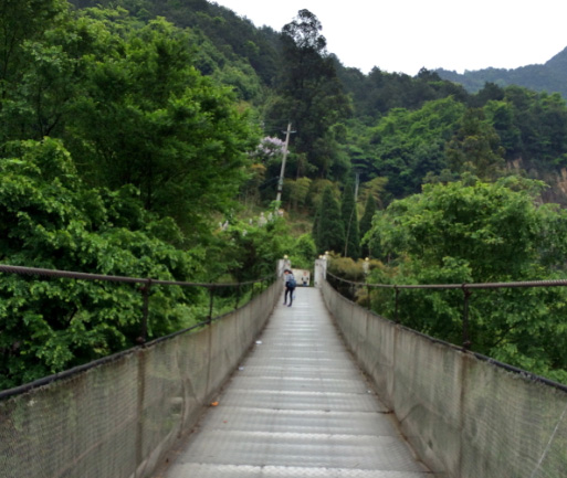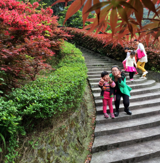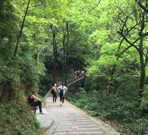 一行人来到山脚下,看到高耸的山峰,心里由衷的感叹:好高啊!开始登山了,我们首先要经过一条索桥,索桥有些许的摇晃,却也不可怕。行于上面如行走在山林间,心胸顿时明朗了起来。随后映入眼帘的便是一层层绵延而上的石做阶梯,千回百转,一望无际。爬的我们办公一族个个是汗流浃背,气喘吁吁。还好风景区特别人性化的在几处阴凉处设有座椅,让登山客能稍作休息补充下体力。