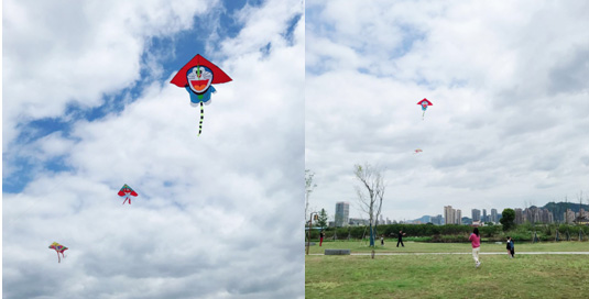 在孩子们的熙熙攘攘下,大人们开始了今天的亲子活动:放风筝。风筝的形式各式各样,有活泼的燕子,美丽的蝴蝶,还有我们童年最想拥有的小伙伴哆啦A梦。经过大人们和小朋友共同努力下,风筝终于飞上了蓝天。三只风筝排队排,呈现出了一副你追我逐的画面。